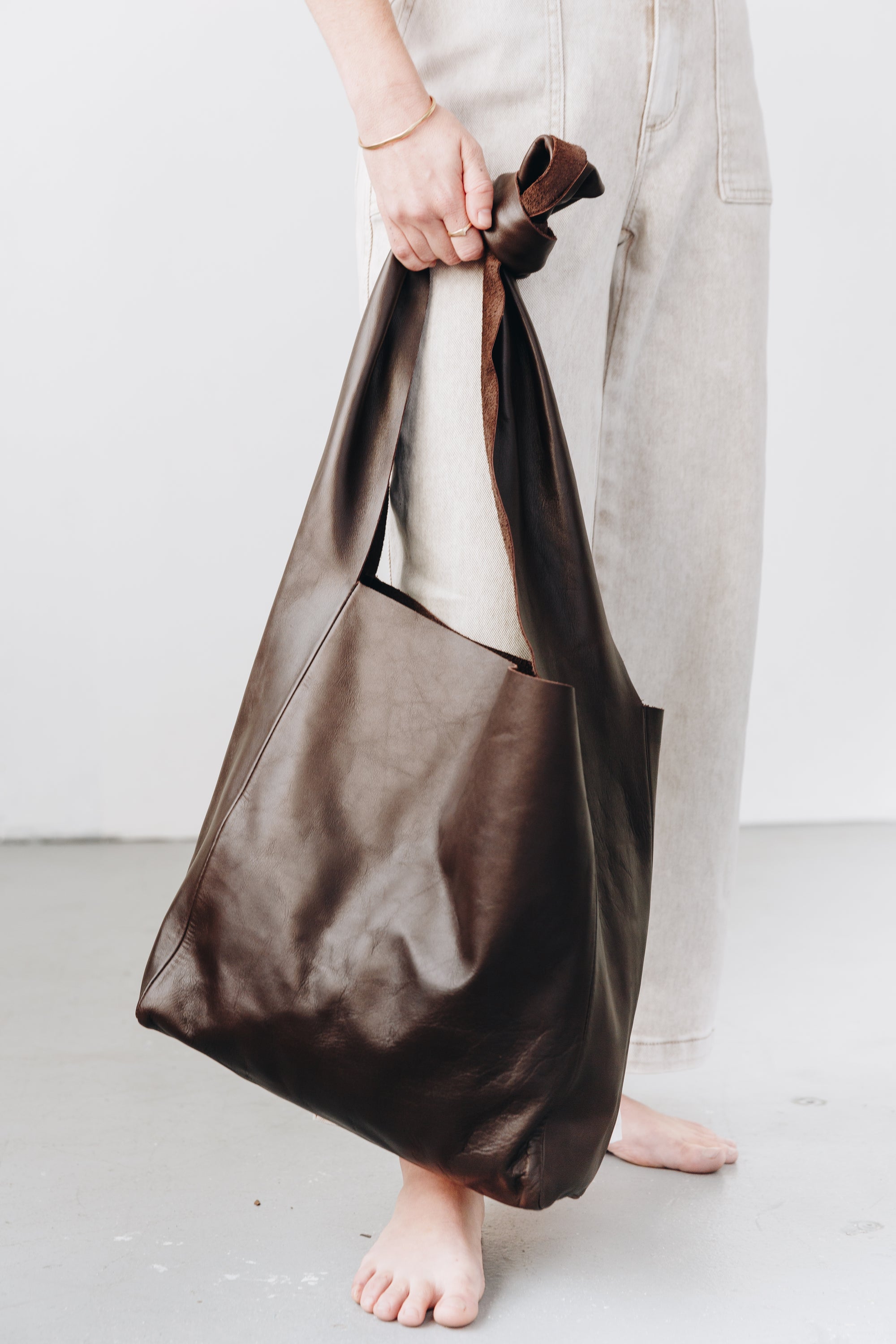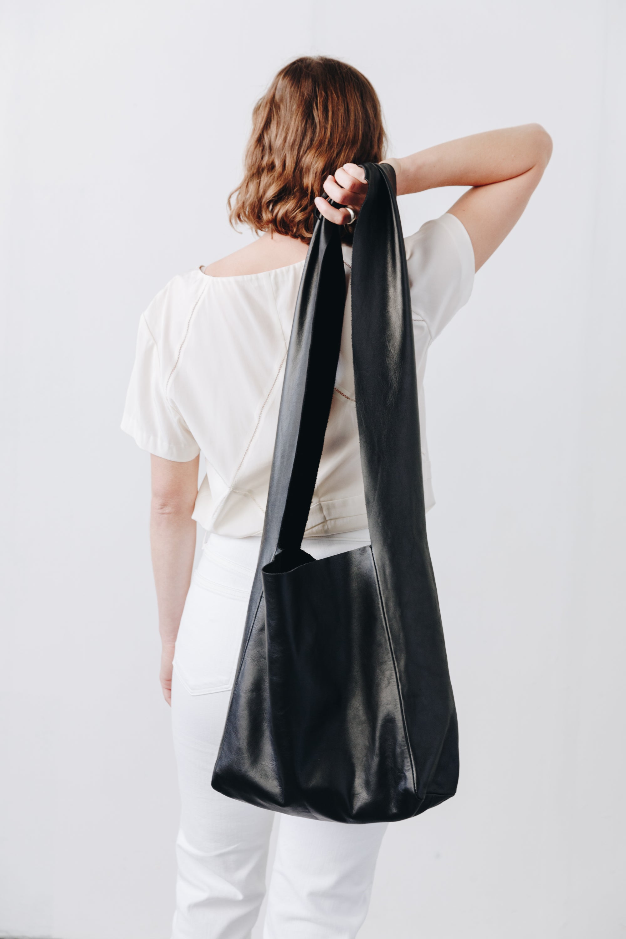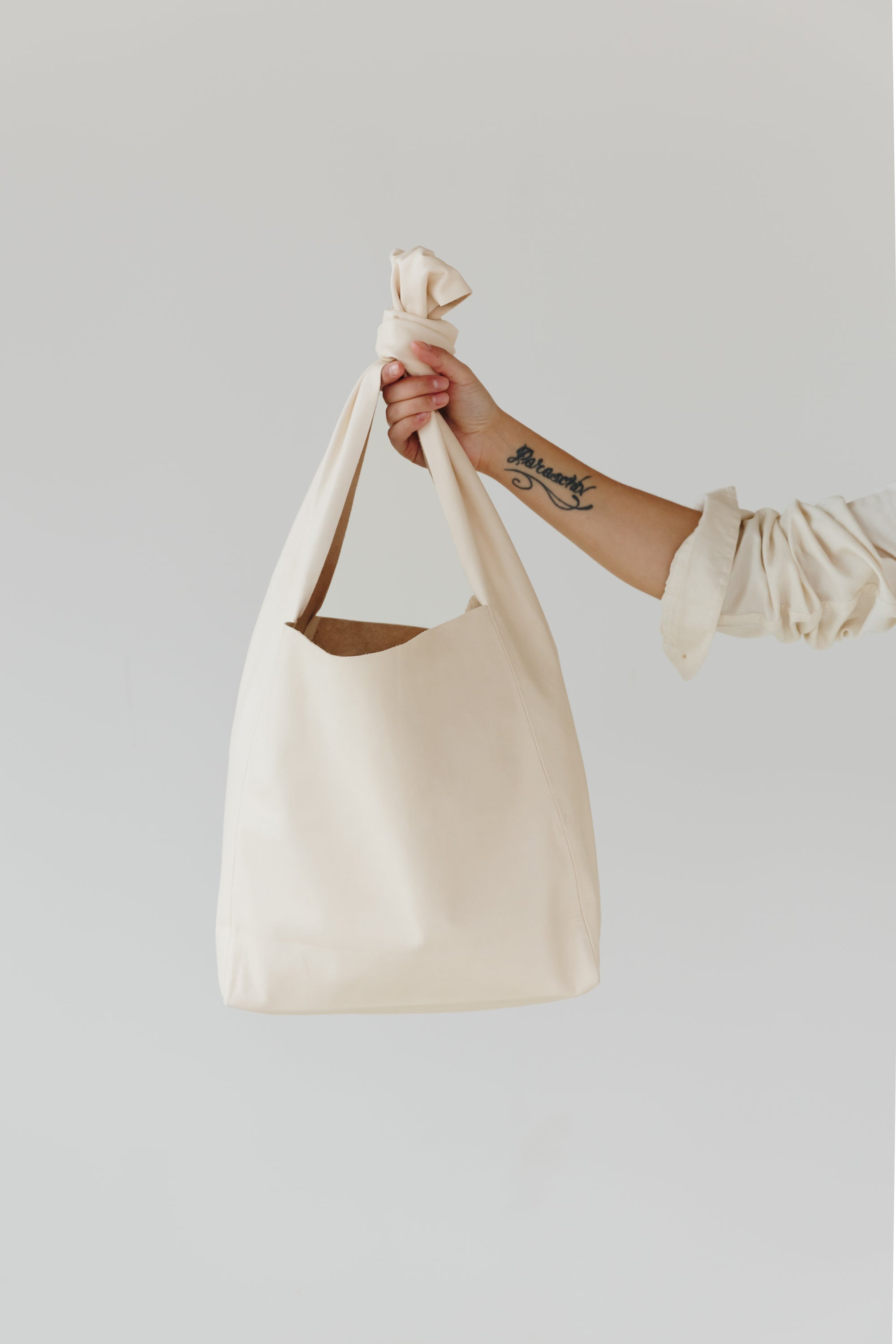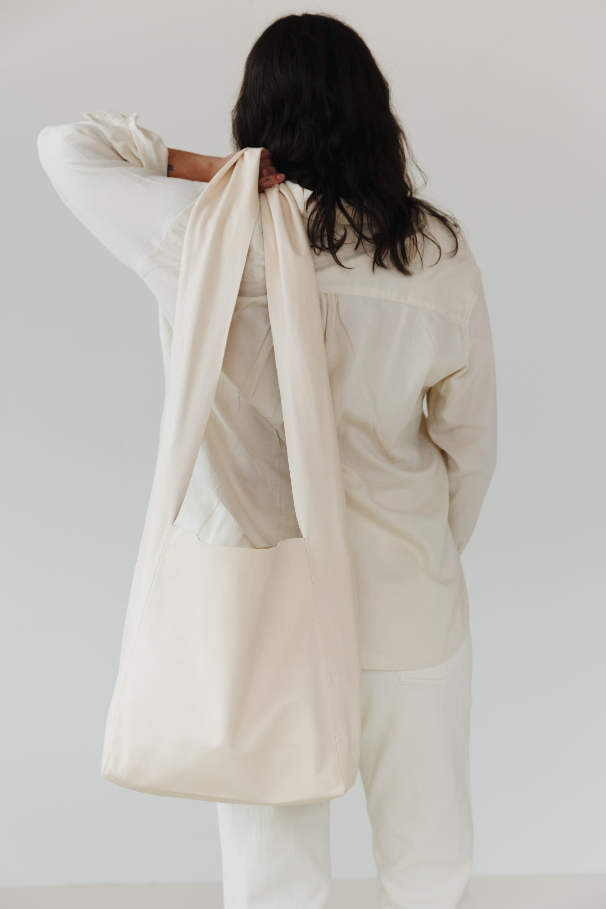 A woman's arm is visible, holding out the strap of a large, soft undyed, natural leather shoulder bag.