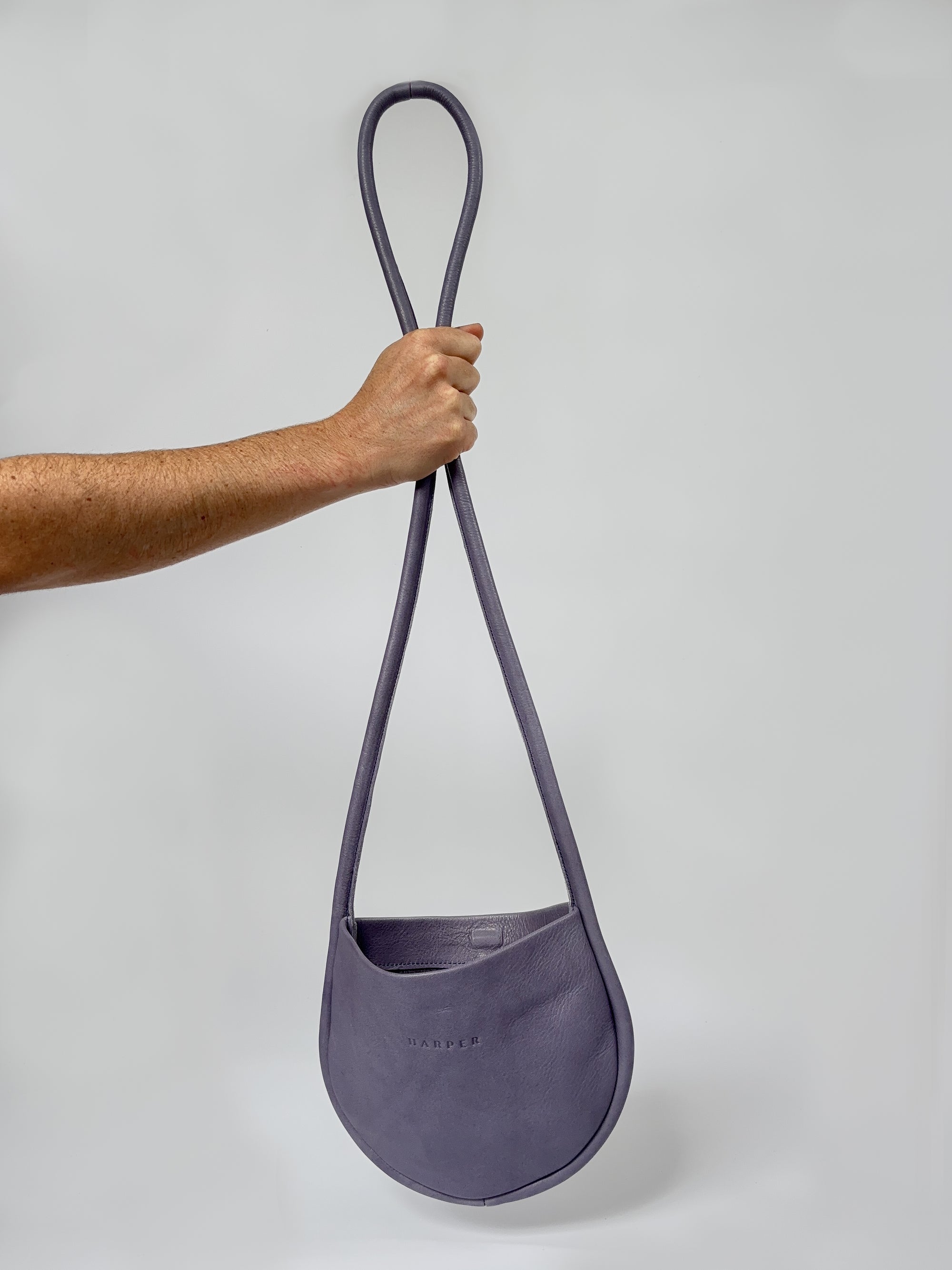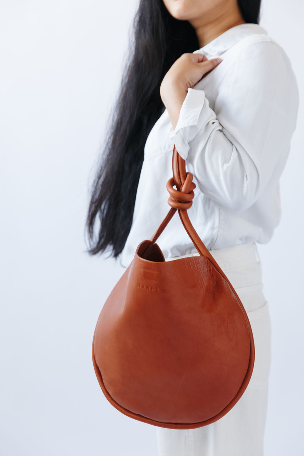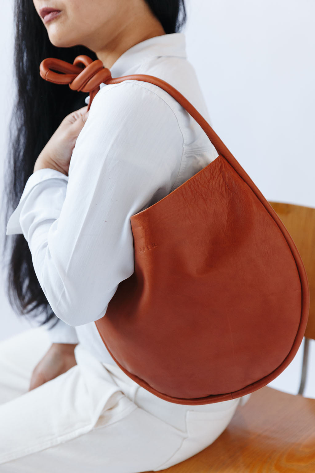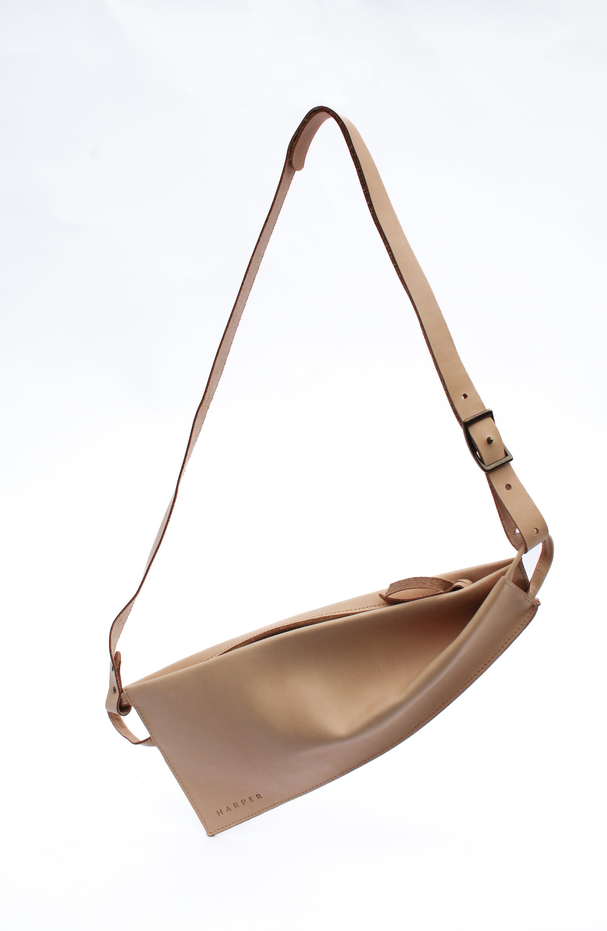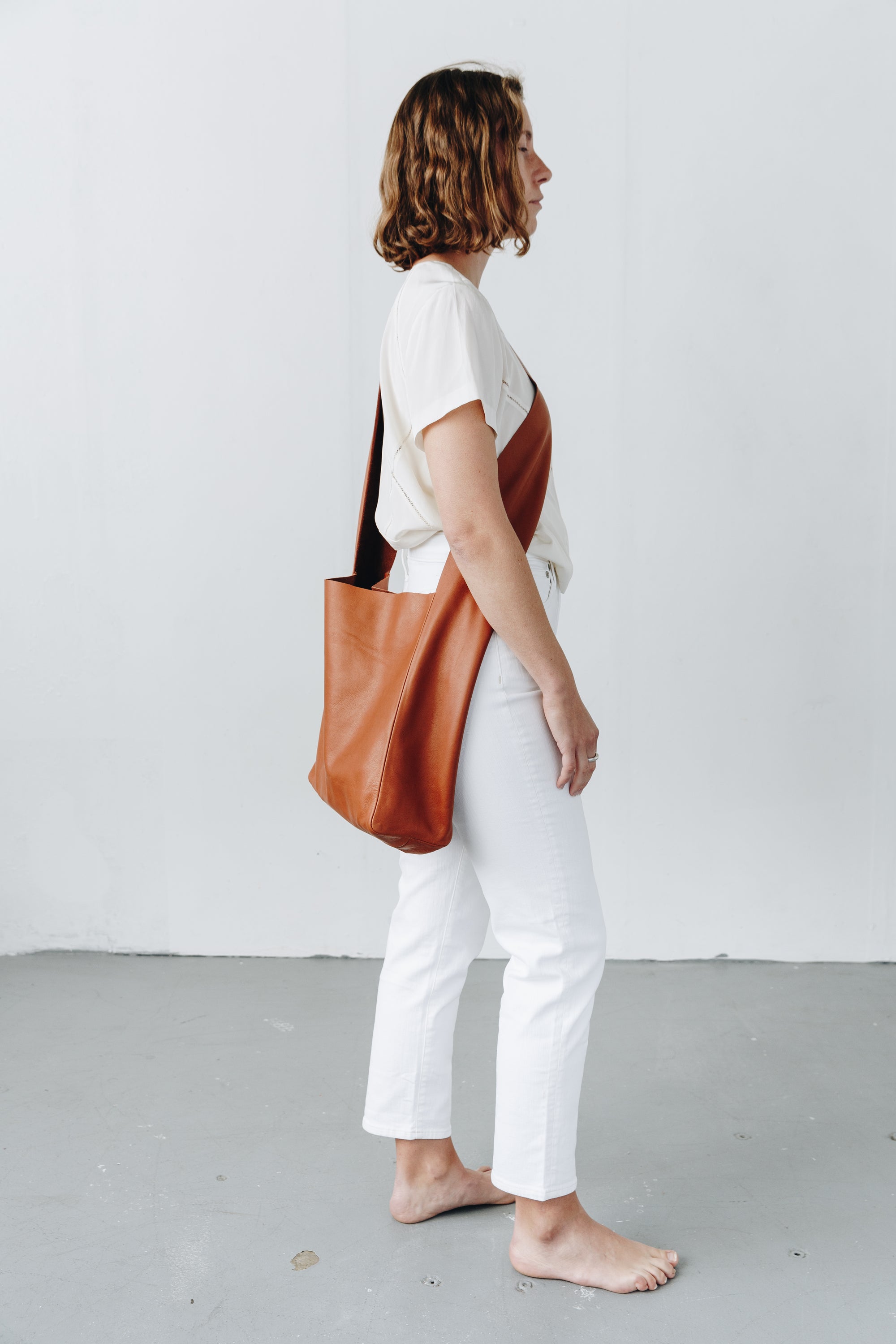 A woman's arm is visible, holding out the strap of a large, soft undyed, natural leather shoulder bag.