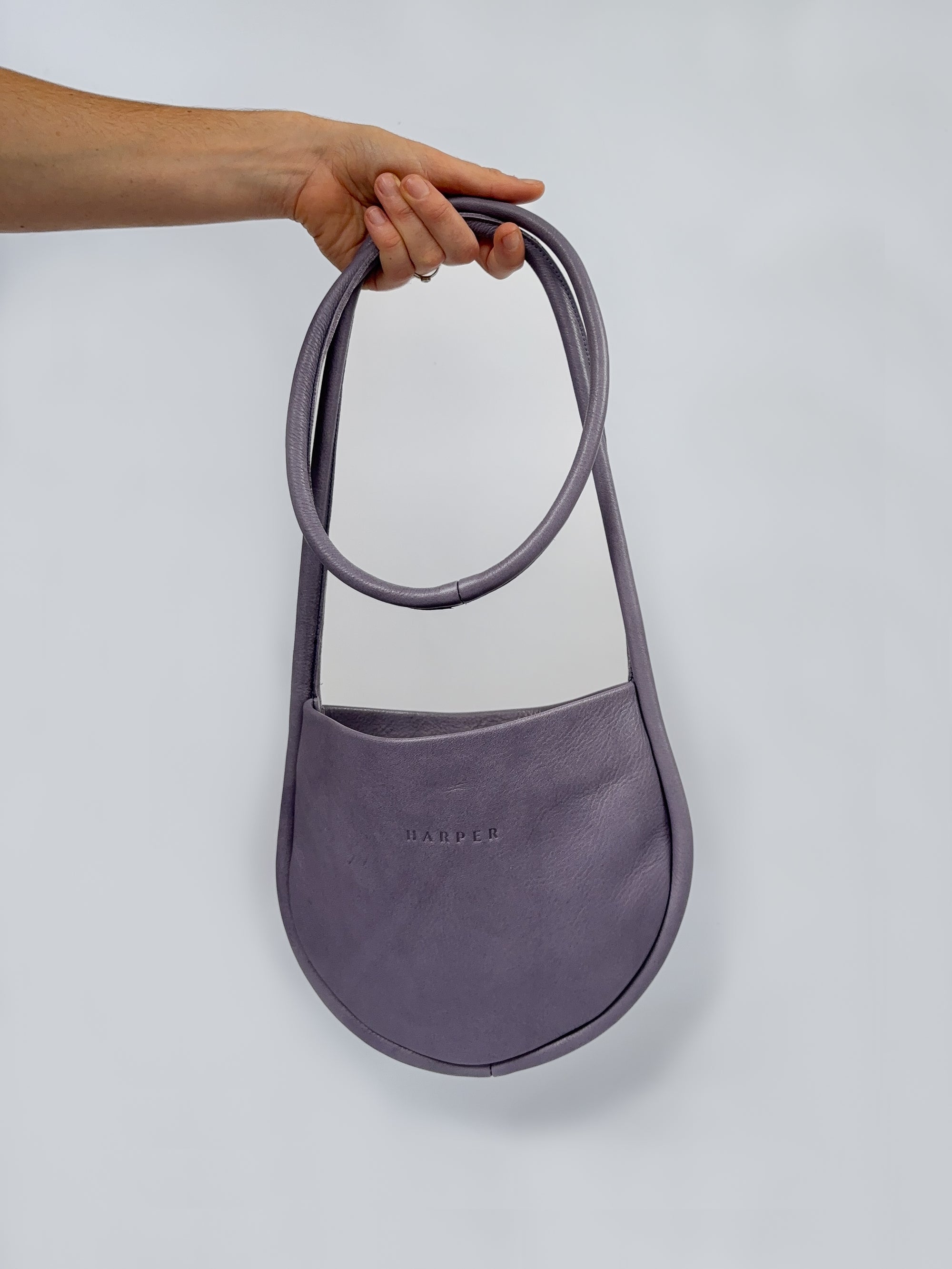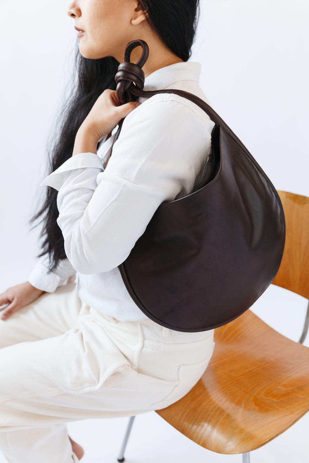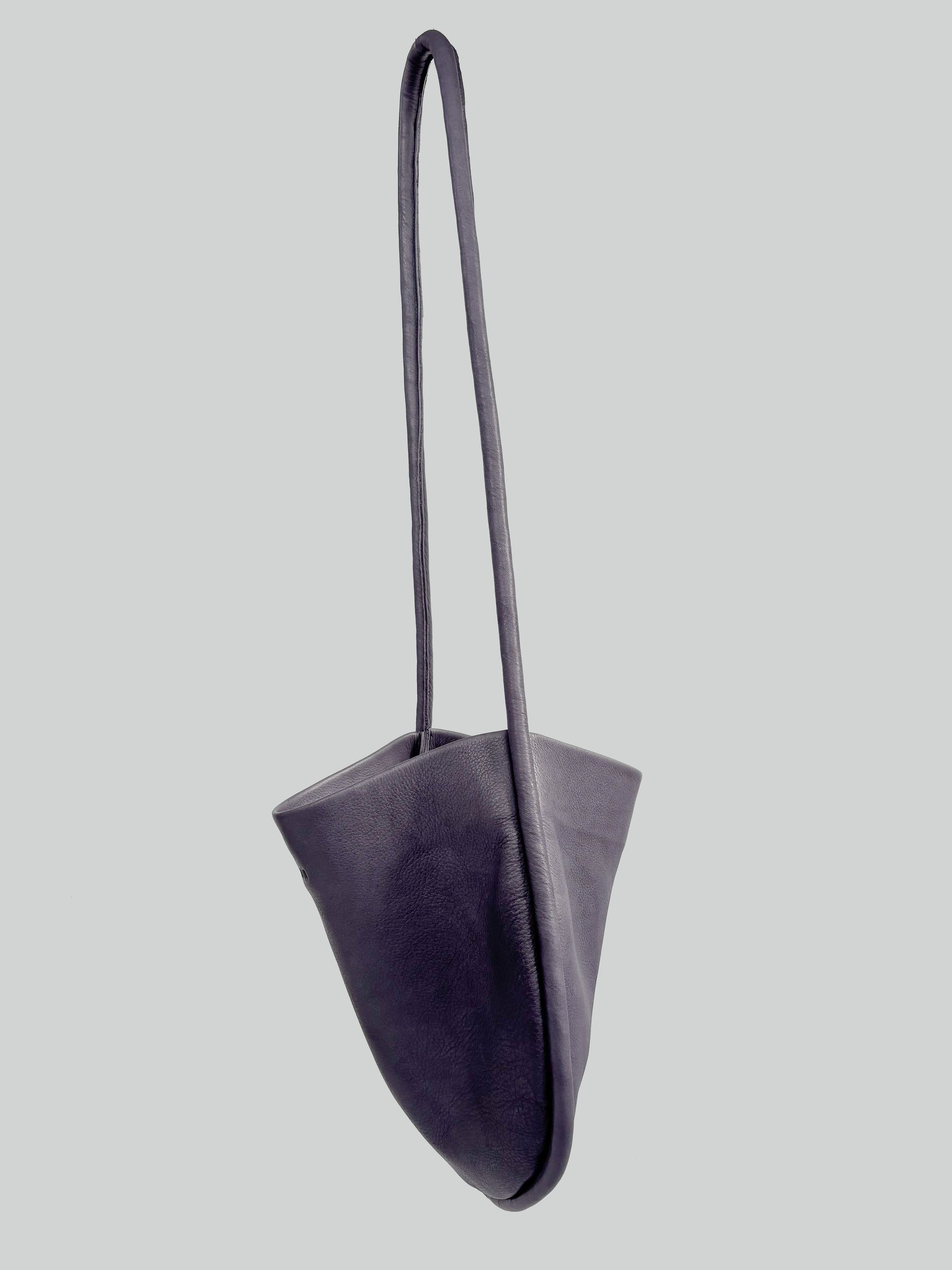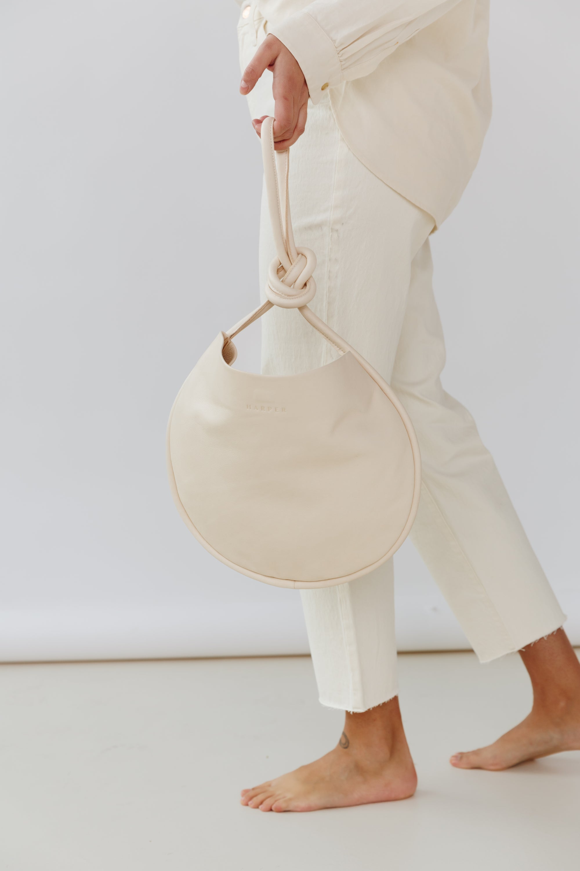 A woman's arm is visible, holding out the strap of a large, soft undyed, natural leather shoulder bag.