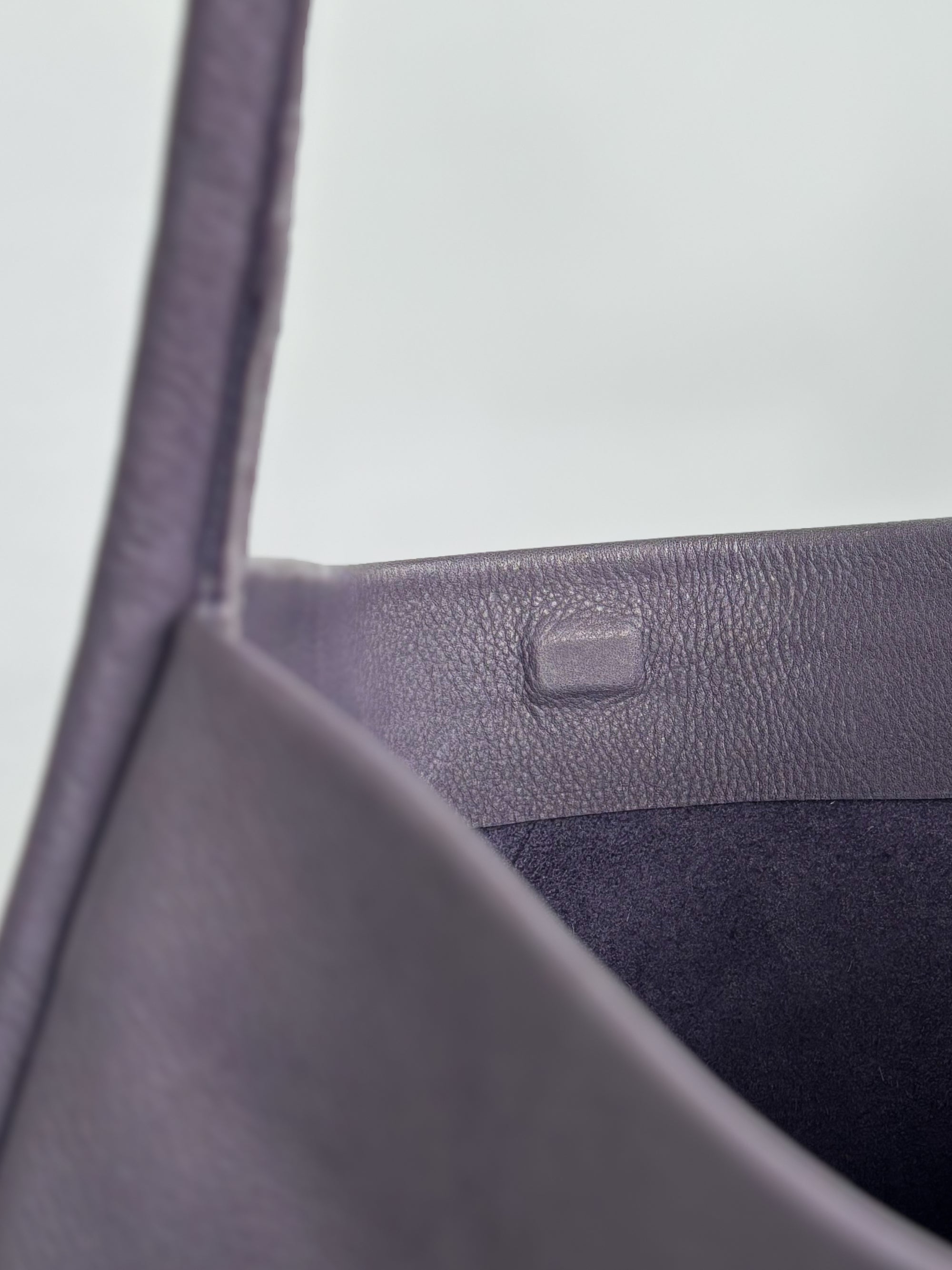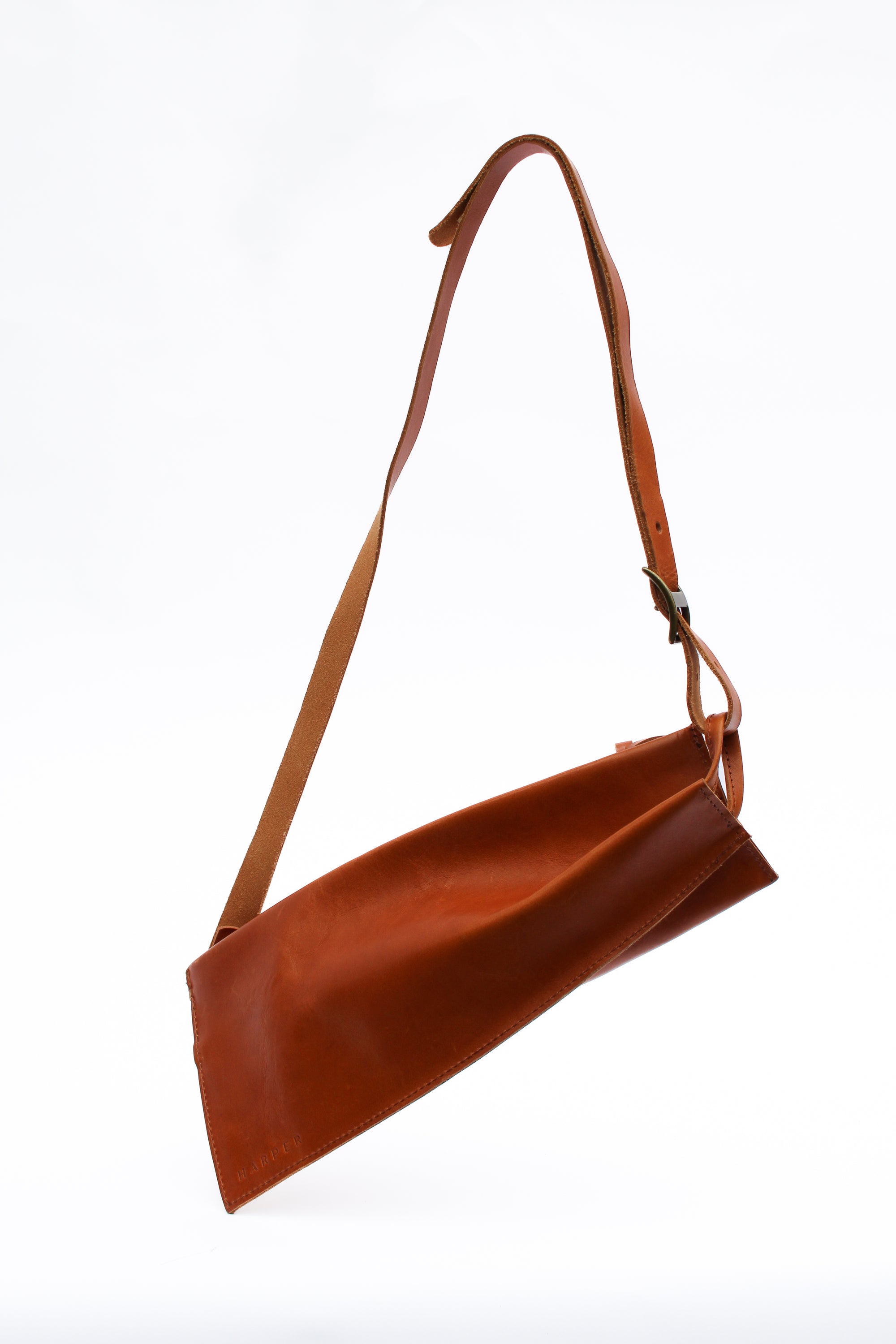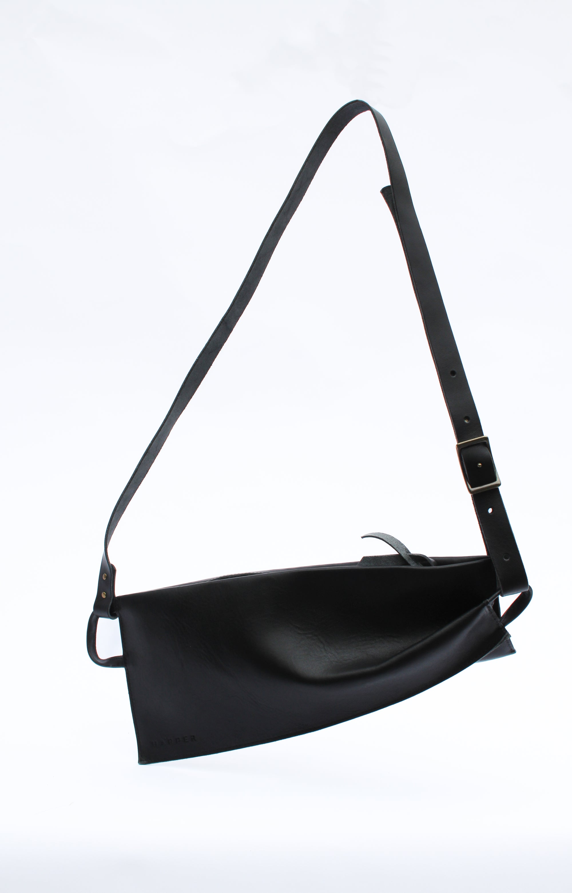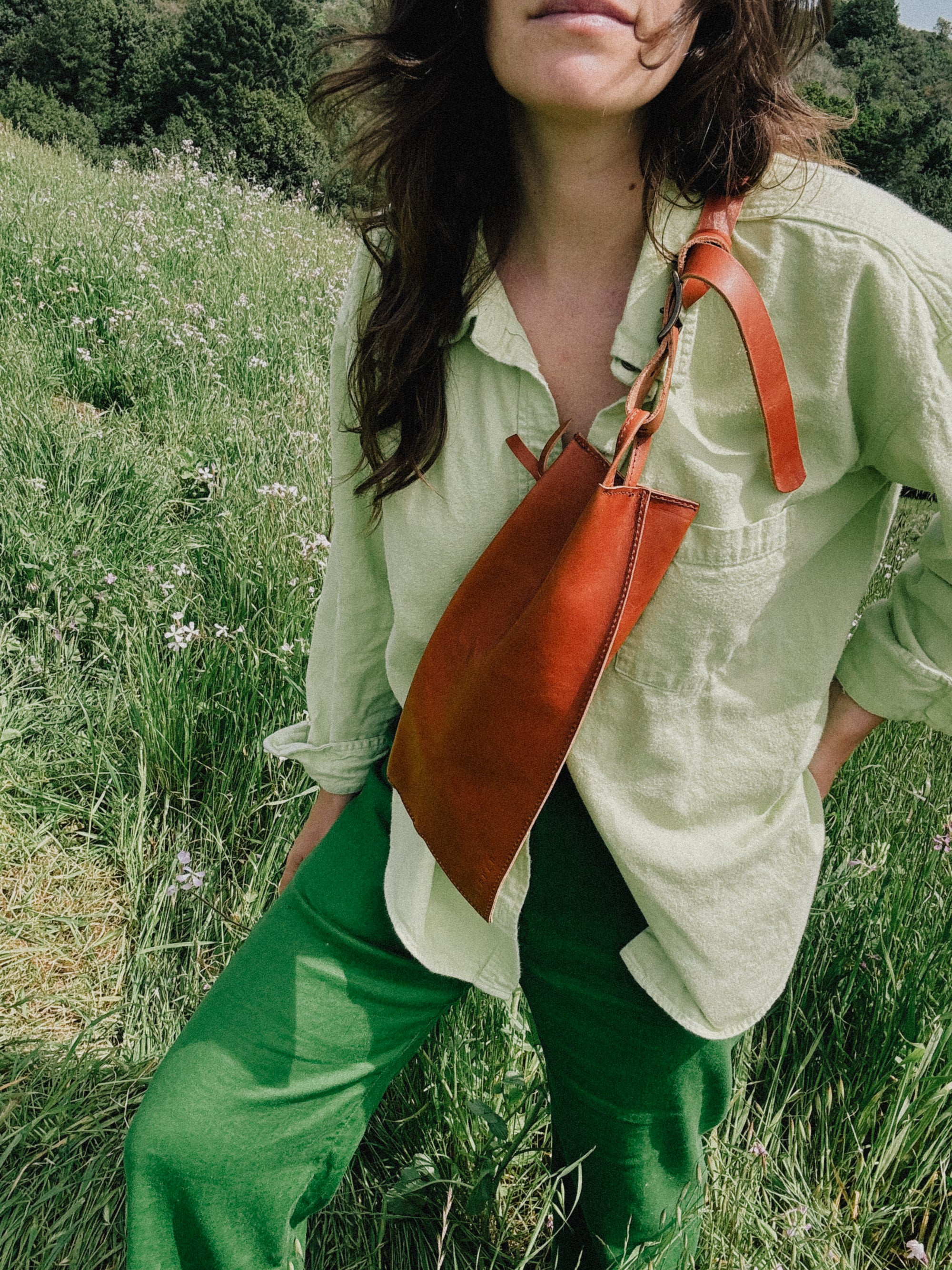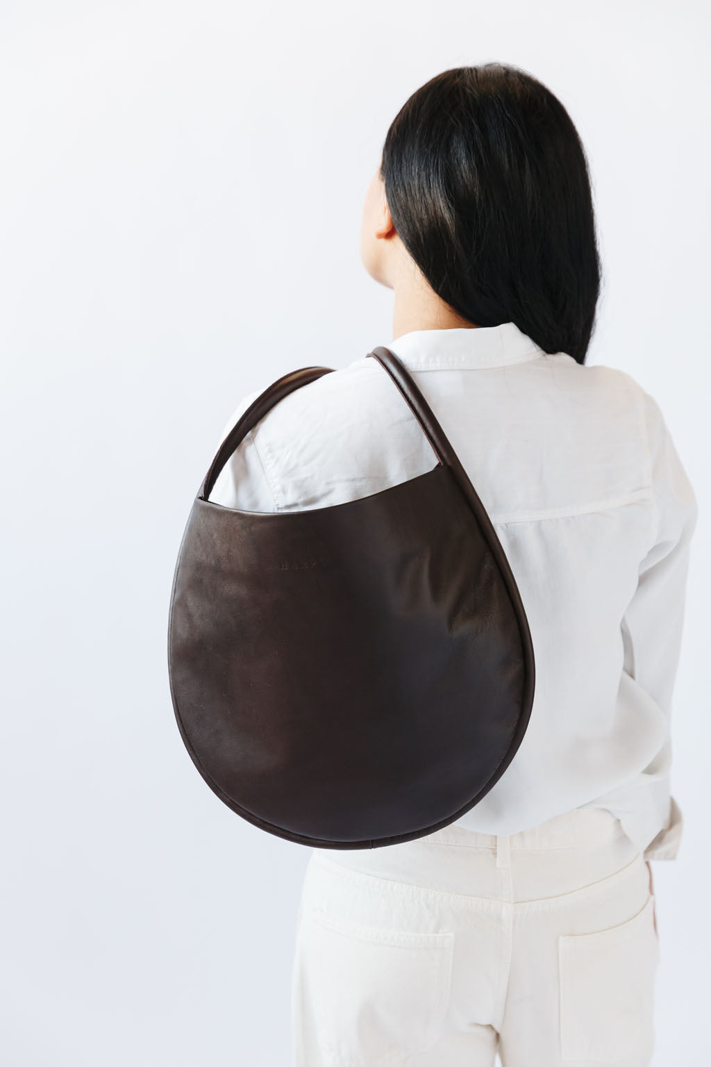 A woman's arm is visible, holding out the strap of a large, soft undyed, natural leather shoulder bag.