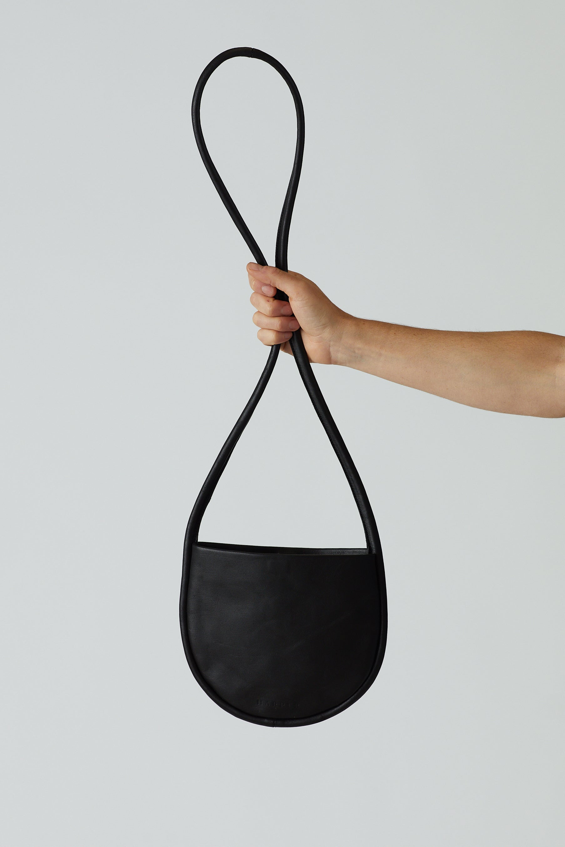 A woman's arm is visible, holding out a black leather shoulder bag by the thin strap. The leather is soft and shiny, and the bag is a half moon shape.